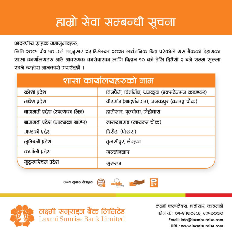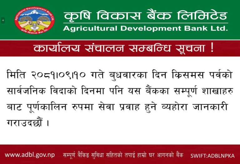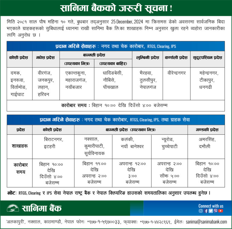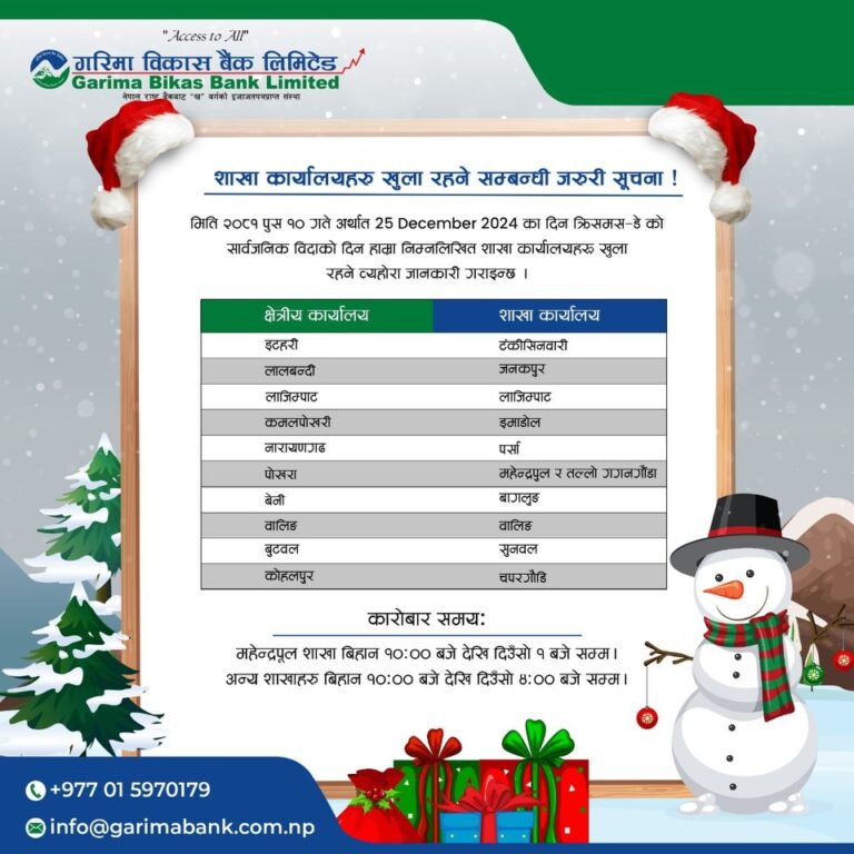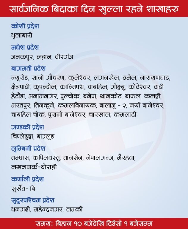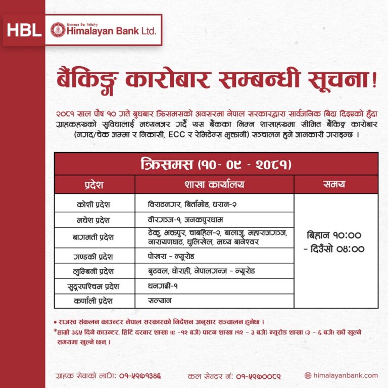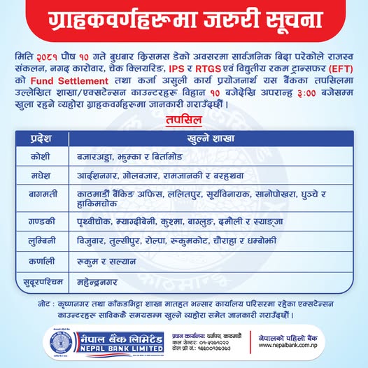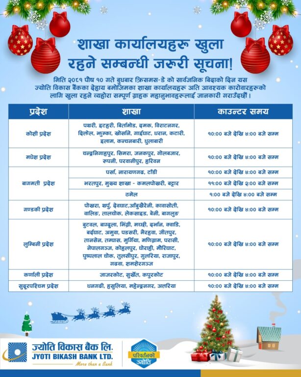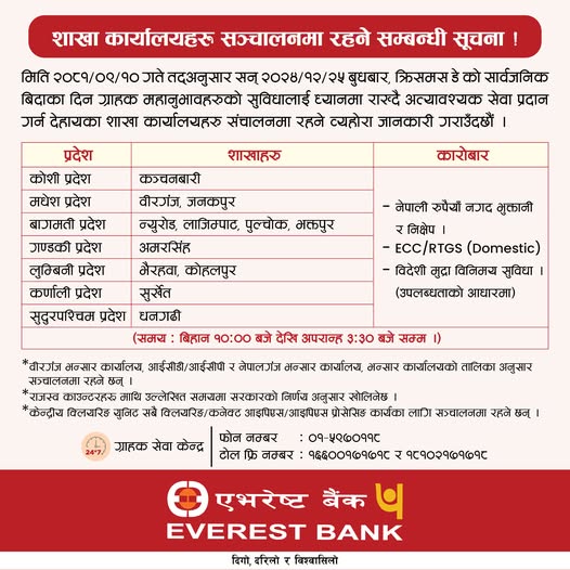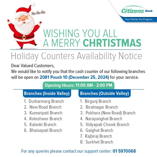 क्रिसमस डेका अवसरमा सरकारले आज सार्वजनिक बिदा दिएको छ । आज बैंक, बीमा कम्पनी, शेयर बजार तथा सरकारी कार्यालयहरू बन्द हुन्छन् । तर, आज सार्वजनिक बिदा भए पनि अधिकांश विकास तथा वाणिज्य बैंकहरूले सेवा दिइरहेका छन् ।