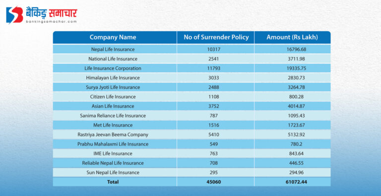 आइएमई लाइफको ७६३ वटा बीमा पोलिसी बापत ८ करोड ४३ लाख रुपैयाँको पोलिसी सरेन्डर भएको हो । सिटिजन लाइफको ११०८ वटा बीमा पोलिसी बापत ८ करोड रुपैयाँको पोलिसी सरेन्डर भएको हो । प्रभु महालक्ष्मी लाइफको ५४९ वटा बीमा पोलिसी बापत ७ करोड ८० लाख रुपैयाँको पोलिसी सरेण्डर भएको हो । रिलायबल नेपाल लाइफको ७०८ वटा बीमा पोलिसी बापत ४ करोड ४६ लाख रुपैयाँको पोलिसी सरेन्डर भएको हो । सन नेपाल लाइफको २९५ वटा बीमा पोलिसी बापत २ करोड ९४ लाख रुपैयाँको पोलिसी सरेन्डर भएको हो ।
