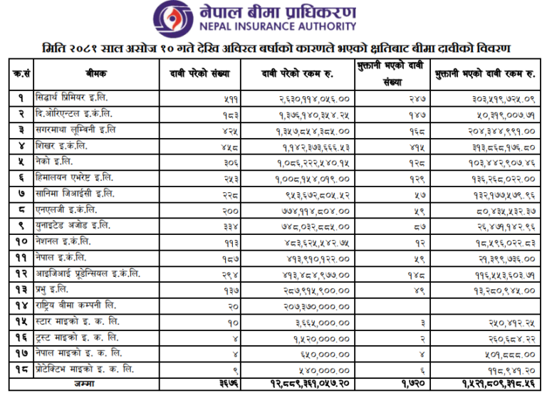 सगरमाथा लुम्बिनीले ४२५ वटा दाबीको १ अर्ब ३५ करोड ७८ लाख रुपैयाँ, नेको इन्स्योरेन्सले ३०६ वटा दाबीको १ अर्ब ८ करोड ६२ लाख रुपैयाँ, हिमालयन एभरेष्टले २५३ वटा दाबीको १ अर्ब ८१ लाख रुपैयाँ, सानिमा जीआईसीले २२८ वटा दाबीको ९५ करोड ३६ लाख रुपैयाँ, एनएलजीले २०० वटा दाबीको ७७ करोड ४१ लाख रुपैयाँ र युनाइटेड अजोडले ३३४ वटा दाबीको ७४ करोड ८० लाख रुपैयाँ भुक्तानी गर्नुपर्ने देखिएको छ।