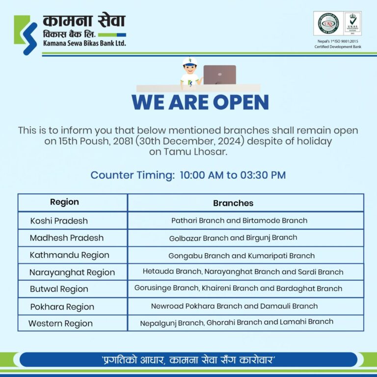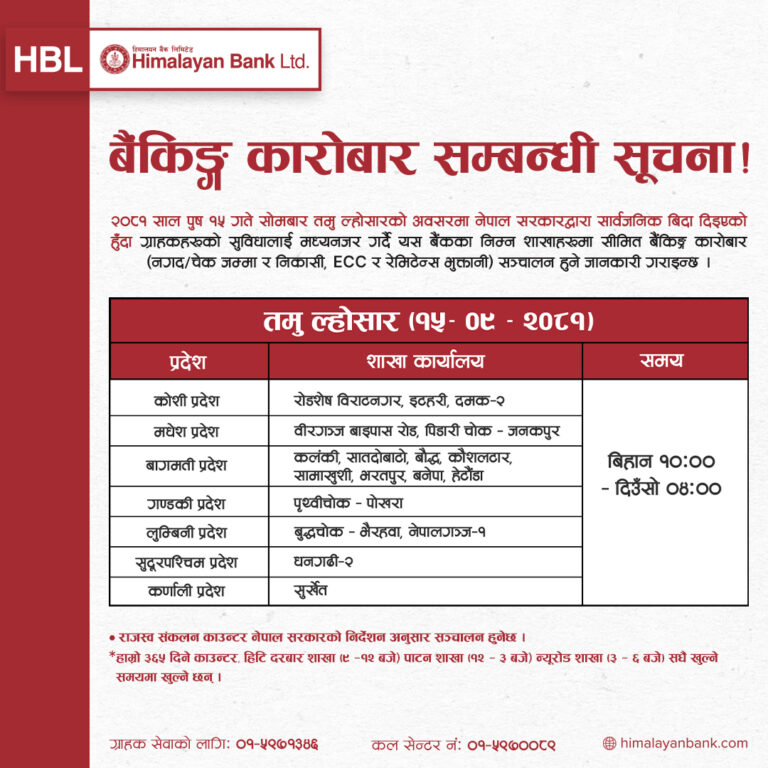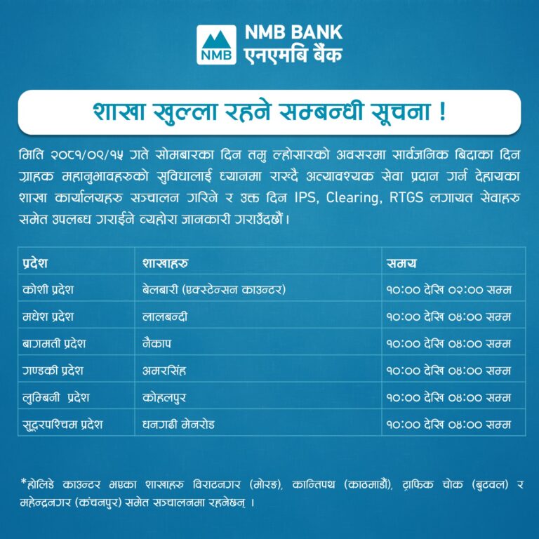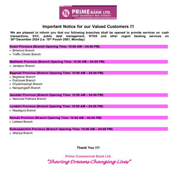 ग्राहकको आवश्यकतालाई केन्द्रमा राख्दै अधिकांश वाणिज्य बैंक तथा विकास बैंकले बैंकिङ्ग सेवा दिइरहेका हुन्। यद्यपि, सेवा दिने सबै बैंकका सबै शाखा भने खुलेका छैनन् । अधिकांश बैंकहरूले केही सीमित शाखाबाट सेवा दिइरहेका छन् ।मंगलबारबाट बैंक तथा वित्तीय संस्थाका साथै शेयर बजारसहित सबै कार्यालय नियमित समयमै खुल्नेछन् ।