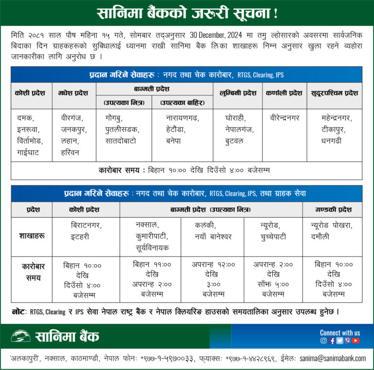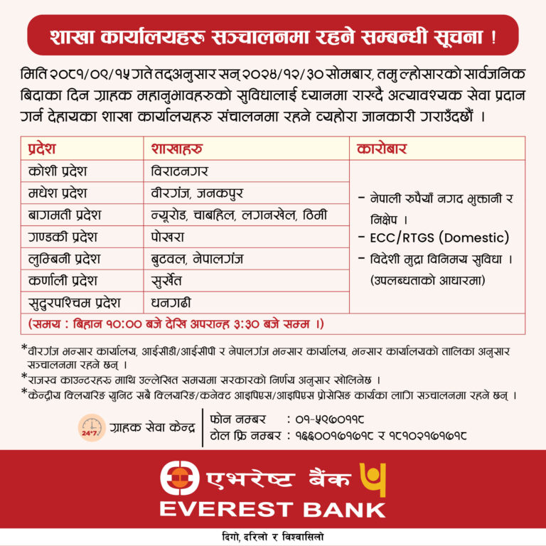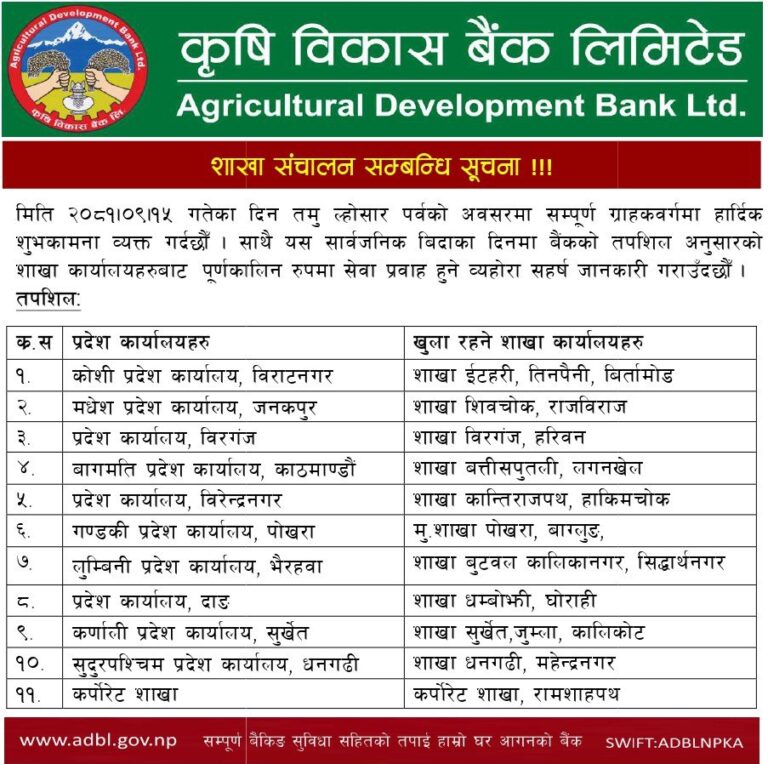 आज बैंक, बीमा कम्पनी, शेयर बजार तथा सरकारी कार्यालयहरू बन्द हुन्छन् । तर, आज सार्वजनिक बिदा भए पनि अधिकांश विकास तथा वाणिज्य बैंकहरूले सेवा दिइरहेका छन् ।
