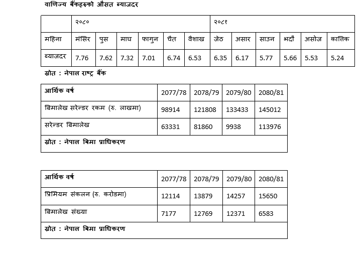 बीमा क्षेत्र पनि अर्थतन्त्रकै एक पाटो हो । बजारमा माग नबढ्दा बीमा क्षेत्र पनि प्रभावित हुन पुगेको छ । यद्यपि पछिल्लो तथ्याङ्कले बीमा व्यवसाय बढेकै देखाउँछ । वैदेशिक रोजगारी र म्यादी बिमालाई छोड्दा पनि समग्रमा बीमा व्यवसायको वृद्धि देखिन्छ । म्यादी, लघु म्यादी, वैदेशिक रोजगार जीवन बिमा लेखसहित करिब ४३ प्रतिशत जनसंख्या बीमाको दायरामा आउनु बीमा व्यवसाय वृद्धि भएको संकेत हो ।
