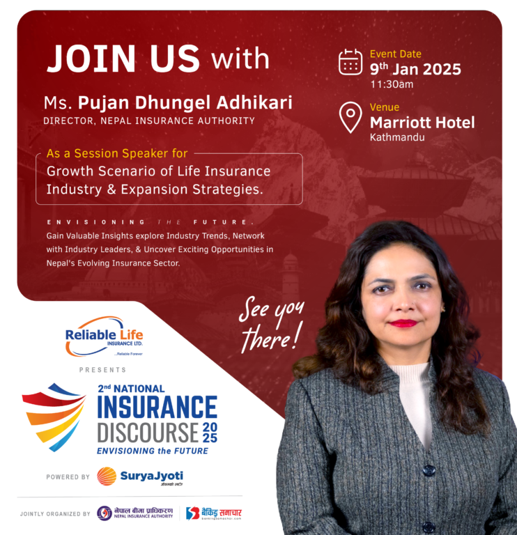 बैंकिङ्ग समाचार डट्कमको आयोजना तथा रिलायबल लाइफ इन्स्योरेन्सको मुख्य प्रायोजनमा पुष २५ गते दोस्रो नेशनल इन्स्योरेन्स डिस्कोर्श २०२५ आयोजना हुने भएको हो । अर्थमन्त्री विष्णु प्रसाद पौडेलद्वारा कार्यक्रमको उद्घाटन गरिनेछ । उक्त कार्यक्रममा नियामकीय निकाय, बीमा कम्पनीहरु, बैंक तथा वित्तीय क्षेत्र, बीमा विज्ञ तथा अन्य क्षेत्रका व्यक्तित्वहरूको उपस्थिति रहने छ ।