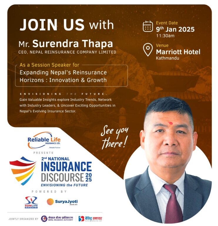 काठमाडौं – बैंकिङ्ग समाचार डट्कम र नेपाल बीमा प्राधिकरणको सहकार्यमा यही पुष २५ गते हुने दोस्रो नेशनल इन्स्योरेन्स डिस्कोर्श २०२५ मा नेपाल रिइन्स्योरेन्सको सीईओ सुरेन्द्र थापा वक्ताका रूपमा सहभागी हुने भएका छन् । छलफलको चौथो सत्रको ‘नेपाली पुनर्बीमा बजारको सीमा विस्तार: व्यवसाय वृद्धिमा नवीनता’ शीर्षकमा हुने छलफलमा वक्ताका रूपमा थापा सहभागी हुने भएका हुन् ।