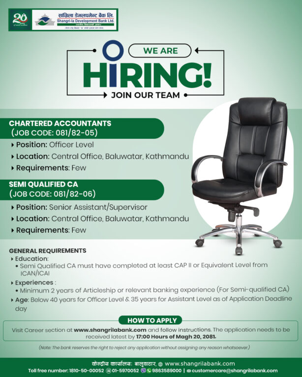 काठमाडौं – सांग्रिला डेभलपमेन्ट बैंक लिमिटेडले दरखास्त आह्रवान गर्दै कर्मचारी माग गरेको छ । बैंकले चार्टर्ड एकाउन्टेन्ट (सीए) र सेमी क्वालिफाइड सीएका लागि कर्मचारी माग गरेको हो ।