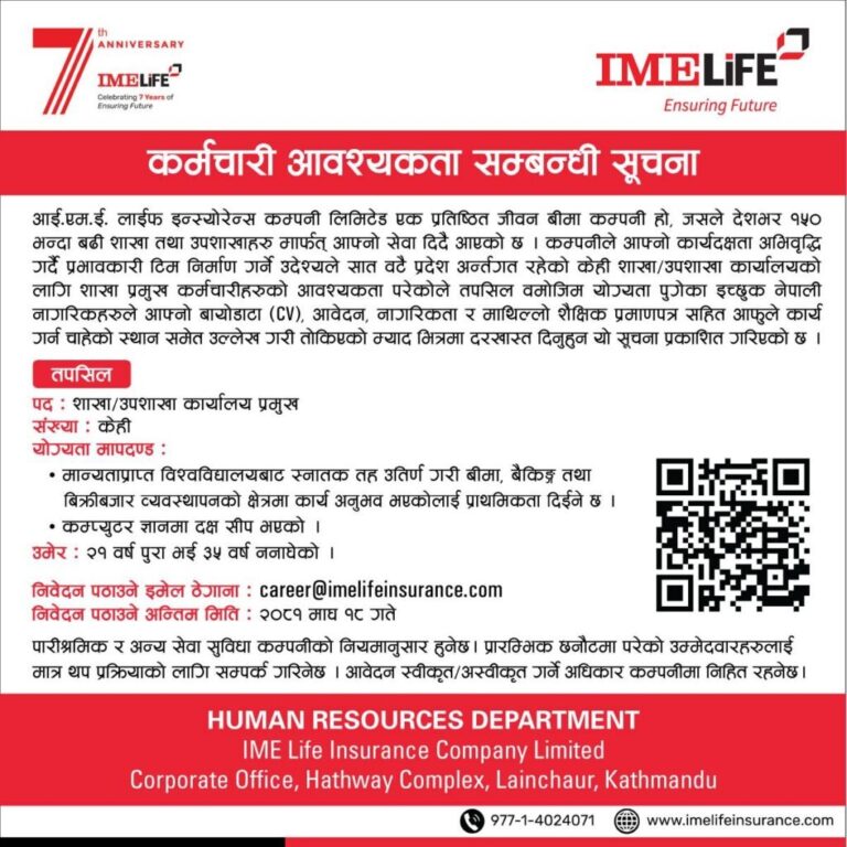 आईएमई लाइफले माग्यो सातै प्रदेशका लागि कर्मचारी, आवेदन दिने म्याद आजसम्म