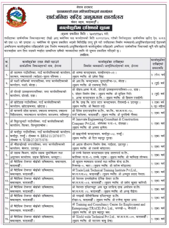 मुख्यव्यक्ति उमेश सिंह रहेको भाव्य कन्ट्रक्सन, पाल्हीनन्दन–२ तीन वर्षको लागि खराब सूचीमा परेको छ। त्यसैगरी, मुख्यव्यक्त रामचन्द्र गिरी रहेको आरसी कन्ट्रक्सन सुन्दर हरैचा-१२ मोरङ २ वर्ष, सोहन आवा जेभी, घोराही, सोहन निर्माण सेवा र आवा कन्ट्रक्सन प्राली दुई-दुई वर्षको लागि खराब सूचीमा परेका छन्।