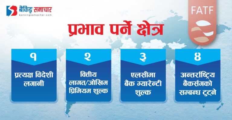 काठमाडौं – ‘फाइनान्सियल एक्सन टास्क फोर्स’ (एफएटीएफ) ले नेपाललाई आगामी २ वर्षका लागि ‘ग्रे लिस्ट’मा राखेसँगै अर्थतन्त्रमा पर्ने प्रभावको आँकलन सुरु भएको छ । खासगरी एफएटीएफको दोस्रो पटक ‘ग्रे लिस्ट’मा परेसँगै यसबाट देशको अर्थतन्त्रमा विविध प्रकारकाे समस्या र प्रभाव उत्पन्न हुन्छ ।