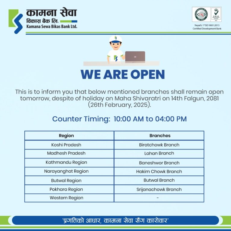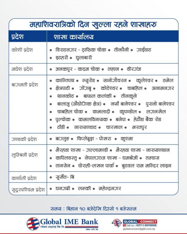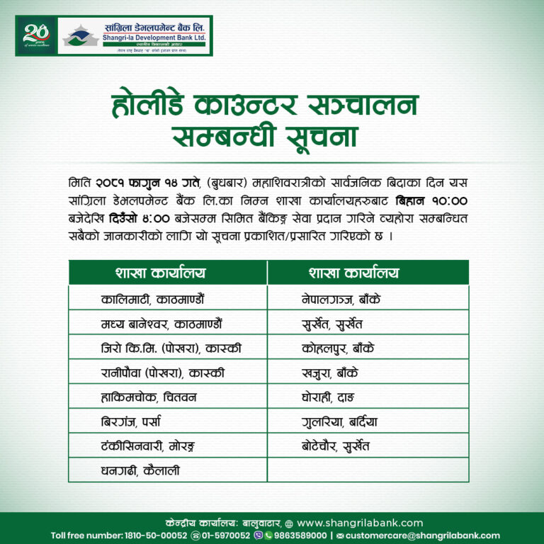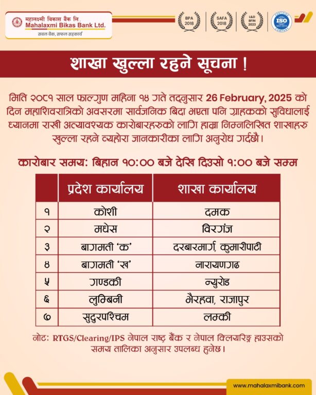 काठमाडौं – सरकारले आज महाशिवरात्रि पर्वकाे देशभर सार्वजनिक बिदा दिएकाे छ । बिदाका दिन शेयर बजार, बैंक तथा वित्तीय संस्था, सरकारी कार्यालय र शिक्षण संस्था बन्द रहनेछन् ।