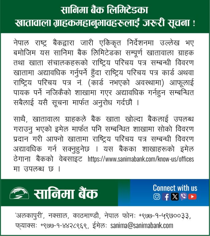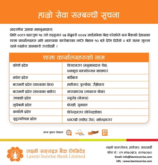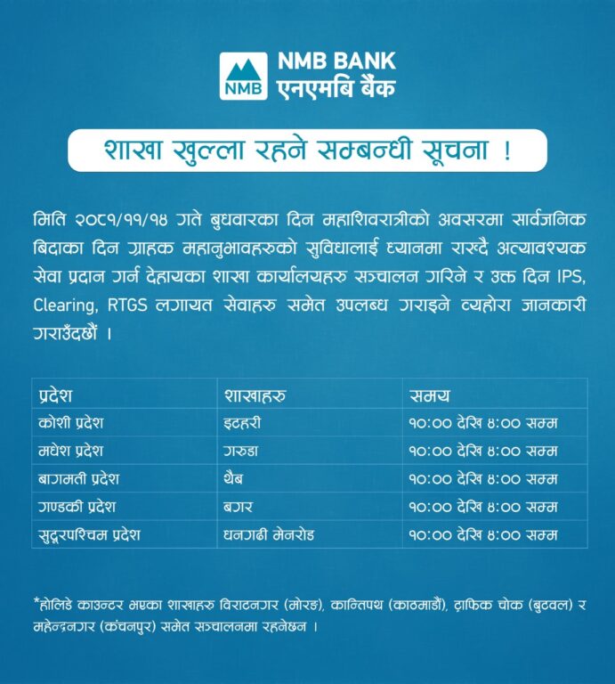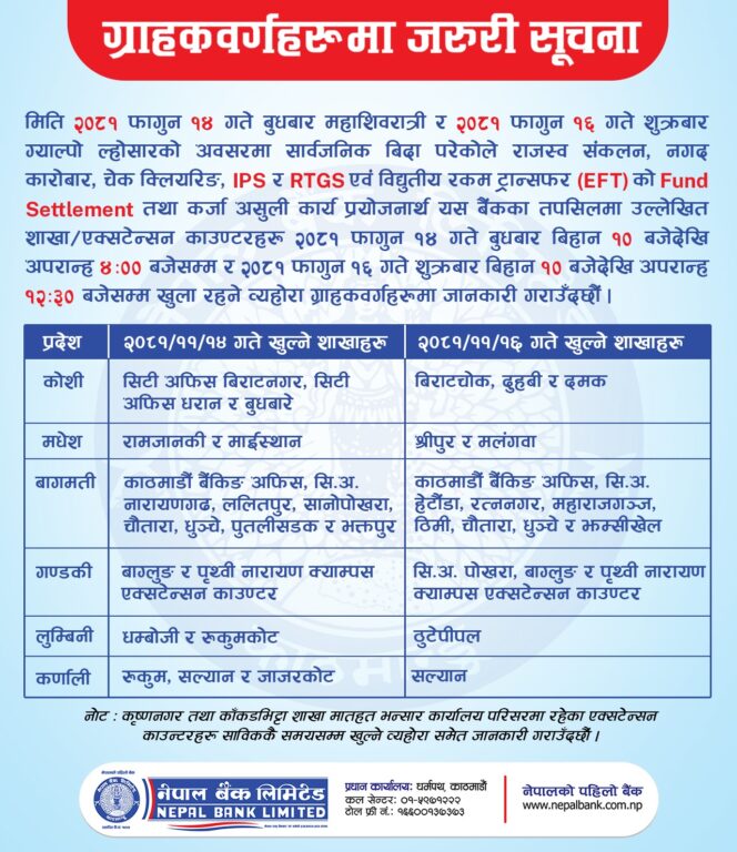 बैंक, बीमा कम्पनी, शेयर बजार तथा सरकारी कार्यालयहरू बन्द हुन्छन् । तर, आज सार्वजनिक बिदा भएपनि अधिकांश विकास तथा वाणिज्य बैंकहरूले सेवा दिइरहेका छन् । बैंकहरूले पूर्णरूपमा सेवा नदिएपनि केही शाखाहरू मार्फत् सेवा दिइरहेका छन् ।