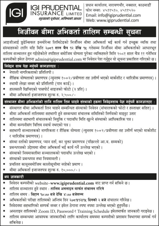 तालिम बिहान १० बजेबाट ४ बजेसम्म अनलाइन मार्फत सञ्चालन हुने जनाइएको छ । बीमा अभिकर्ता तालिमको अन्तिम दिन चैत १५ गते परीक्षा दिनको २ बजे सञ्चालन हुनेछ ।