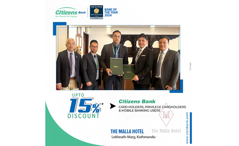 सो समझदारी पत्रमा हस्ताक्षर पश्चात् सिटिजन्स बैंकका कार्डबाहक, प्रिभिलेज कार्ड बाहक र मोबाइल बैंकिङ ग्राहकहरूले द मल्ल होटलमा १५ प्रतिशत आकर्षक छुट पाउनेछन् । यस किसिमको सहकार्यबाट बैंकका ग्राहकहरु लाभान्वित हुनुका साथै नगद कारोबारबाट डिजिटल कारोबार तर्फ उत्प्रेरित हुने विश्वास बैंकले लिएको छ ।