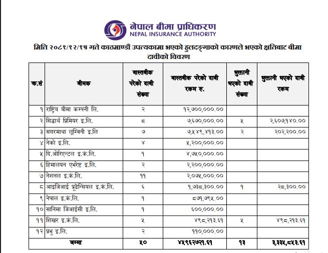 हालसम्म कम्पनीहरूले कुल ४ करोड ५९ लाख ६२ हजार ७२१ रुपैयाँ भुक्तानी गर्नुपर्ने देखिएको छ। वैशाख ३ गतेसम्म कम्पनीहरूमा हुलदङ्गाबाट भएको क्षतिमा ५० वटा दाबी परेका छन्। हालसम्म कम्पनीहरूले १३ वटा दाबीको ३३ लाख ३५ हजार ८५३ रुपैयाँ भुक्तानी गरिसकेका छन्।