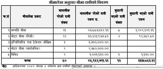 कम्पनीहरूले ८ वटा सम्पत्ति बीमालेख अन्तर्गतका ३२ लाख ४२ हजार, मोटर बीमा निजीतर्फ ९२ हजार र विविध अन्तर्गत १ हजार १३० रुपैयाँ भुक्तानी दिएका हुन् । यसैगरी दोस्रो धेरै दाबी मोटर बीमा निजीतर्फ परेको छ। कम्पनीहरूमा मोटर बीमा निजी तर्फ २२ वटा दाबी परेका छन्। ती दाबीको कम्पनीहरूले १ करोड ६ लाख २३ हजार ९७७ रुपैयाँ भुक्तानी गर्नुपर्ने देखिएको छ। हालसम्म कम्पनीहरूले ४ वटा दाबीको ९२ हजार ३८२ रुपैयाँ भुक्तानी गरेका छन्।
