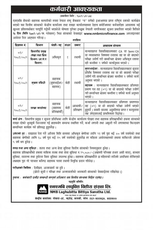 कम्पनीले हेड अफिस तथा विभिन्न शाखाका लागि कर्मचारी माग गरेको हो । इच्छुक तथा योग्यता पुगेकाले सूचना प्रकाशित भएको मितिले १५ दिन अर्थात् वैशाख १९ गतेभित्र आवेदन दिनुपर्नेछ ।