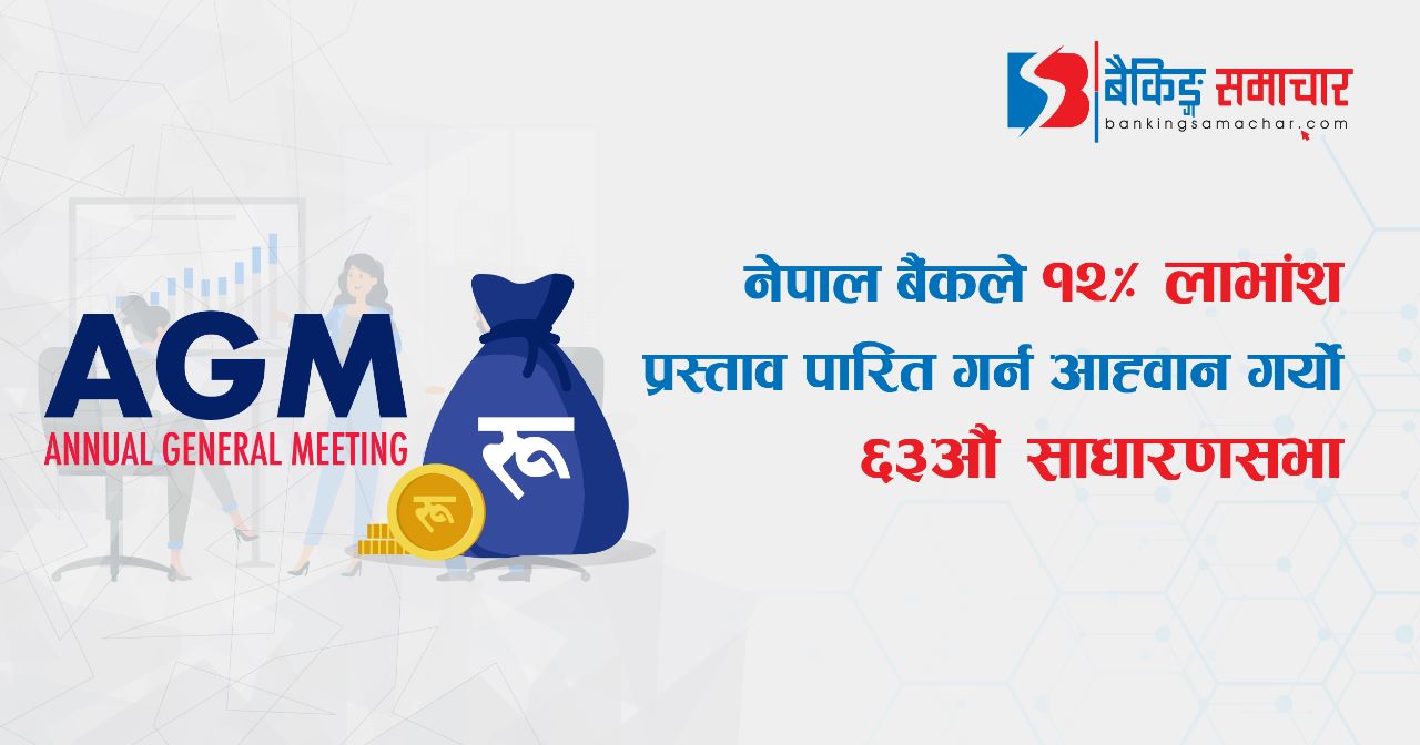 नेपाल बैंक लिमिटेडले पुस २९ गते ६३औं वार्षिक साधारण सभा आह्वान गरेको छ । बैंकको पुस ६ गतेको सञ्चालक समितिको बैठकले काठमाडौं, धर्मपथस्थित बैंकको प्रधान कार्यालयमा बिहान ११ बजे सभा गर्ने निर्णय गरेको हो ।