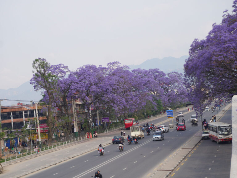 ललितपुर – ललितपुर महानगरपालिका–१४ स्थित चक्रपथ वरपर वैजनी रङको जाकाराण्डा फूल ढपक्क फुलेको छ । वसन्त ऋतुमा फूल्ने यस फूलले यहाँको शोभा बढाएको छ । अचेल दिनहुँजसो फूल र चक्रपथलाई पृष्ठभूमिमा राखेर तस्बिर र भिडियो खिच्ने युवायुवतीको उपस्थिति झनै हेर्न लायक हुन्छ । चक्रपथ वरपर ढपक्क फूल फूलेपछि तस्बिर खिच्नलाई भीडभाड हुने गरेको ललितपुर महानगरपालिका–१४ का वडाध्यक्ष अमृत महत बताउँछन । उनी भन्छन्, ‘हरेक वर्ष यसयाममा फूलको मौसम आउँछ । यसमा युवायुवतीहरू रमाइरहेको देख्दा खुसी लाग्छ ।’
