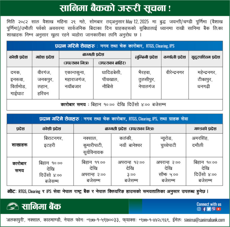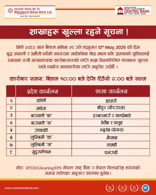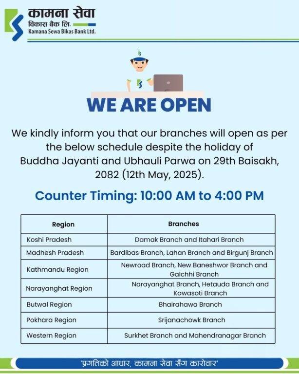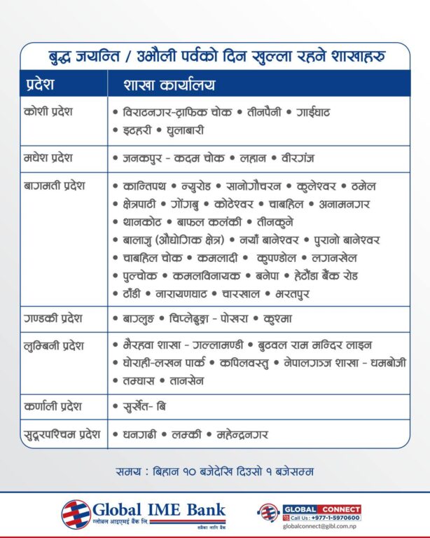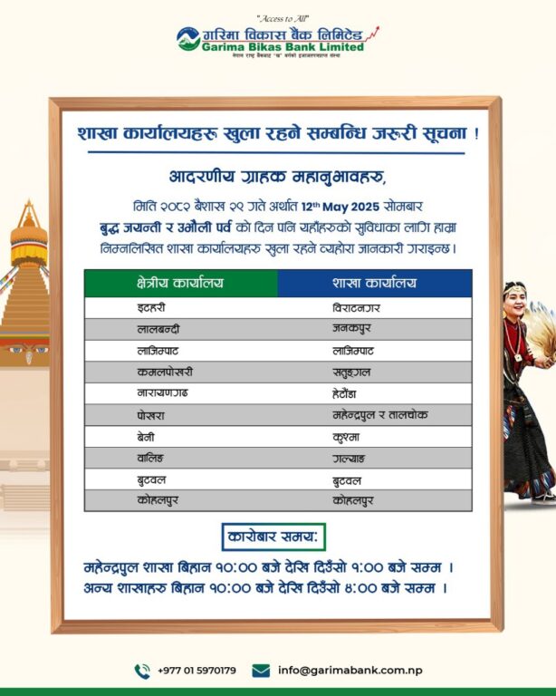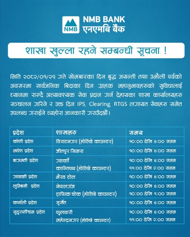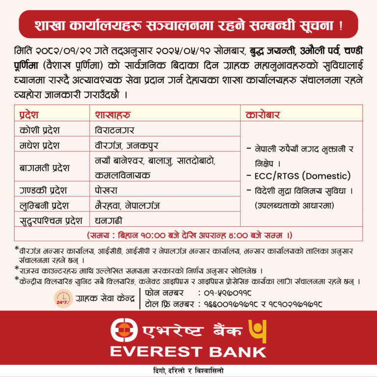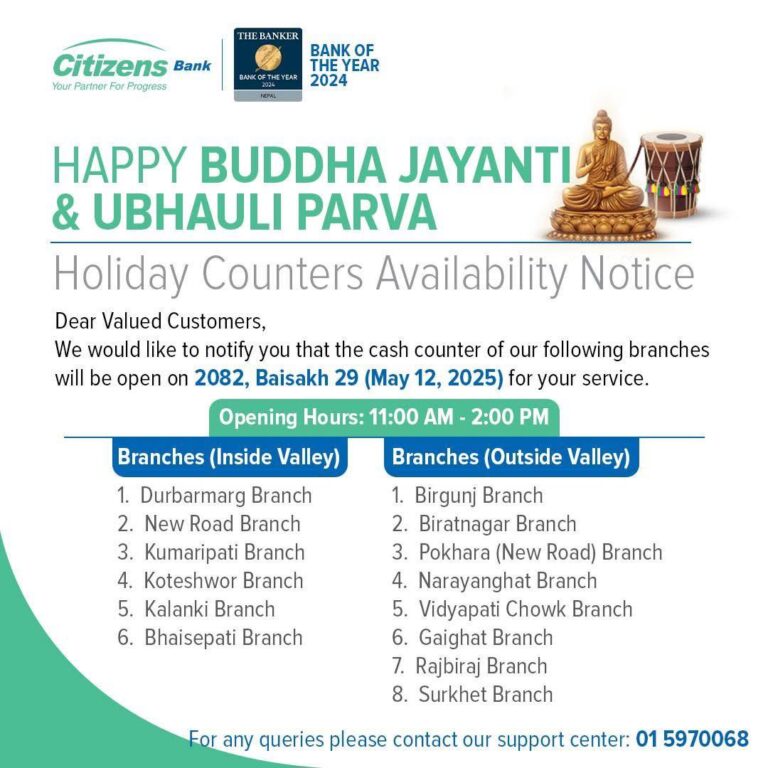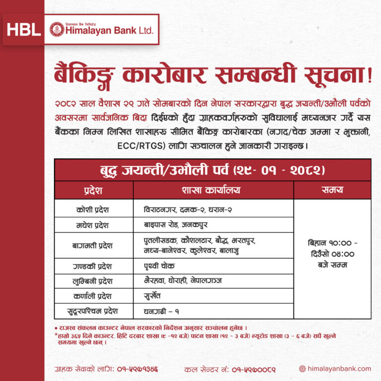 काठमाडौं – सरकारले बुद्ध जयन्ती तथा उभौली पर्वका अवसरमा आज सोमबार सार्वजनिक बिदा दिएको छ । सार्वजनिक बिदाको दिन पनि आफ्ना ग्राहकहरूको आवश्यकतालाई मध्यनजर गर्दै अधिकांश  बैंकहरुले  सेवा दिइरहेका हुन् ।