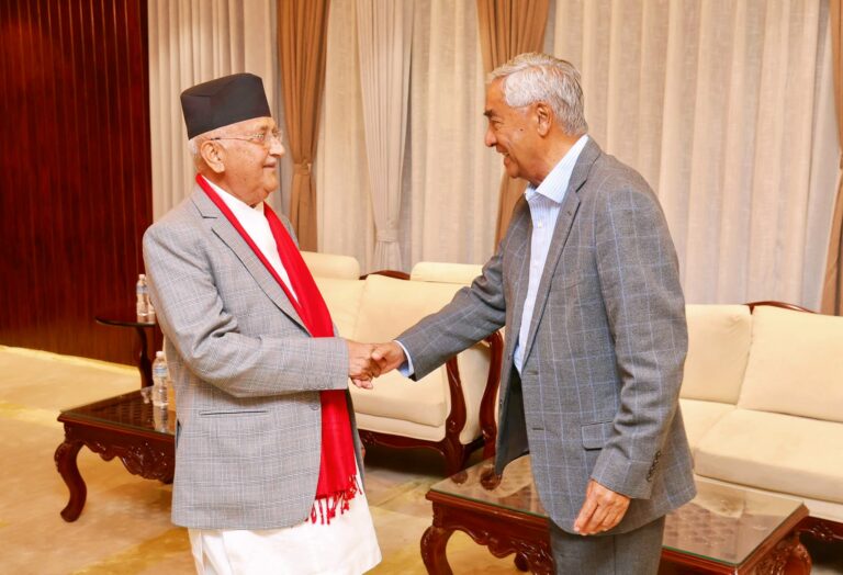काठमाडौं – राजनीतिक भागबन्डाका कारण देशको केन्द्रीय बैंक गभर्नर विहीन बनेको समयमा सरकारमा रहेका दुई ठुला दलका प्रतिनिधिबीच भेटवार्ता भएको छ । मंगलबार सरकारी निवास बालुवाटारमा प्रधानमन्त्री केपी शर्मा ओली र नेपाली कांग्रेसका सभापति शेरबहादुर देउवाबीच भेटवार्ता भएको हो । प्रधानमन्त्री सचिवालयका अनुसार प्रधानमन्त्री ओली र देउवाबीच करिब एक घण्टादेखि छलफल जारी छ ।