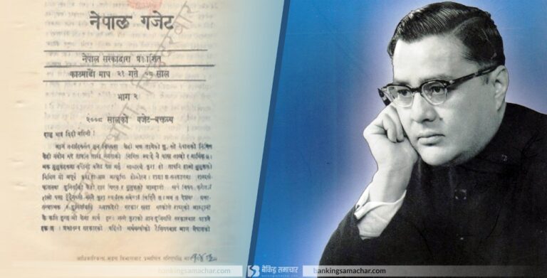 याेसँगै नेपालमा बजेट प्रस्तुत गर्ने थालिएको ७४ वर्ष भएको छ। नेपालमा पहिलो पटक वि.स. २००८ साल माघ २१ गते तत्कालीन अर्थमन्त्री सुवर्ण शमशेर जबराले पहिलो बजेट ल्याएका थिए। उनले ल्याएको बजेट नै नेपालको पहिलो सरकारी हिसाबकिताब सहितको पहिलो बजेट हो। त्यसयता, निरन्तर (केही वर्ष बाहेक) प्रत्येक वर्ष बजेट प्रस्तुत हुँदै आएको छ। काँग्रेसका मातृकाप्रसाद कोइराला प्रधानमन्त्री र काँग्रेसका अर्थमन्त्री सुवर्ण शमशेर राणाले नेपालको पहिलो बजेट ल्याएका हुन्। नेपालको पहिलो बजेट ५ करोड २५ लाख २९ हजार रुपैयाँको थियो।नेपालको पहिलो बजेट तीन हजार पाँच सय शब्द हाराहारीको थियो।
