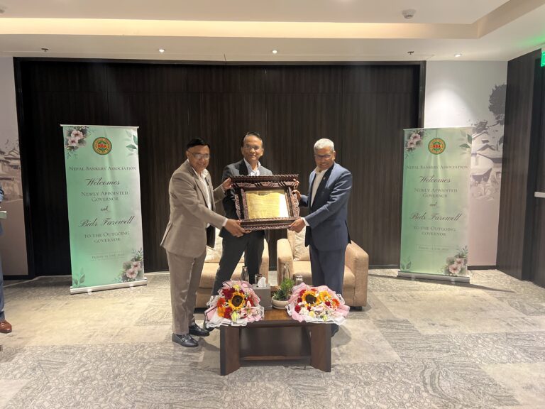 काठमाडौं – नेपाल बैंकर्स संघद्वारा गभर्नरहरूको स्वागत तथा विदाइ कार्यक्रम सम्पन्न भएको छ । नेपाल बैंकर्स संघले एक विशेष कार्यक्रमको आयोजना गरी नेपाल राष्ट्र बैंकका निवर्तमान गभर्नर महाप्रसाद अधिकारीलाई विदाइ तथा नव नियुक्त गभर्नर डा. विश्वनाथ पौडेललाई स्वागत कार्यक्रमको आयोजना गरेको हो ।