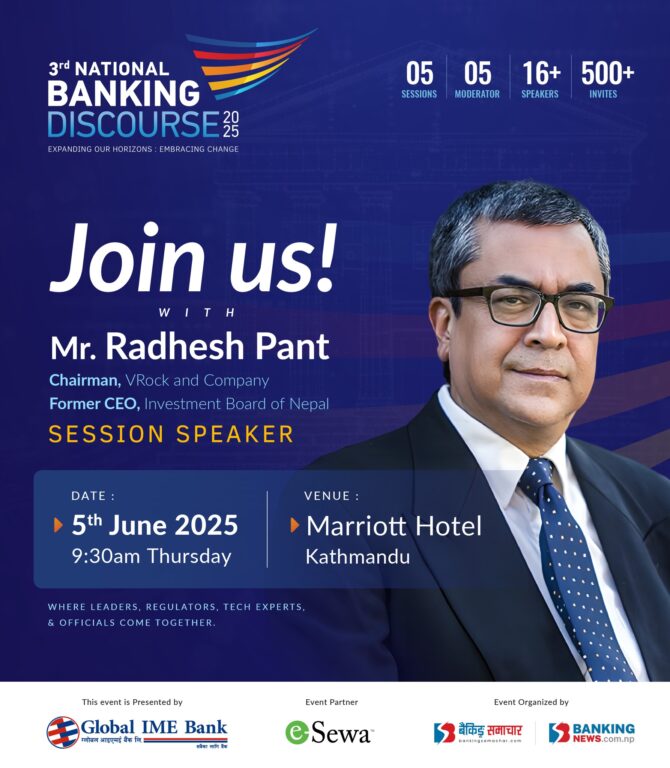 बैंकिङ्ग समाचारको आयोजनामा यही जेठ २२ गते तेस्रो ‘नेशनल बैंकिङ्ग डिस्कोर्श २०२५’ आयोजना हुने भएको छ। सन् २०२३ देखि आयोजना हुँदै आइरहेको राष्ट्रियस्तरको बैंकिङ्ग डिस्कोर्शको तेस्रो संस्करण यही जेठ २२ गते हुने भएको हो। काठमाडौंको म्यारियट होटलमा आयोजना हुने डिस्कोर्शको उद्घाटन उपप्रधान एवं अर्थमन्त्री विष्णुप्रसाद पौडेलले गर्नेछन्। बैंकिङ्ग समाचार डटकमको आयोजना तथा ग्लोबल आईएमई बैंकको मुख्य प्रायोजनमा जेठ २२ गते तेस्रो नेशनल बैंकिङ्ग डिस्कोर्श २०२५ आयोजना हुने भएको हो ।