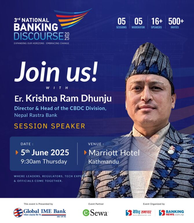 काठमाडौं – तेस्रो बैंकिङ्ग डिस्कोर्श २०२५ को तेस्रो सत्रको वक्ताका रूपमा नेपाल राष्ट्र बैंकको निर्देशक कृष्ण राम धुँजु सहभागि हुने भएका छन् । बैंकिङ्ग समाचार डटकमको आयोजनामा आगामी जेठ २२ गते हुने तेस्रो बैंकिङ्ग डिस्कोर्शको तेस्रो सत्र ओपन बैंकिङ्ग र फिनटेक: सहकार्य, प्रतिस्पर्धा र नेपालमा नियो-बैंकको नियमाकीय अवधारणा मा वक्ताका रूपमा सहभागी हुने भएका हुन् ।