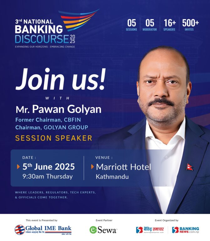 काठमाडौं – तेस्रो बैंकिङ्ग डिस्कोर्श २०२५ को चौथो सत्रको वक्ताका रुपमा बैंक तथा वित्तीय संस्था परिसंघका पुर्व अध्यक्ष तथा गोल्यान ग्रुपका अध्यक्ष पवन गोल्यान सहभागी हुने भएका छन् । बैंकिङ्ग समाचार डटकमको आयोजनामा आगामी जेठ २२ गते हुने तेस्रो बैंकिङ्ग डिस्कोर्शको चौथो सत्र ‘मौद्रिक नीतिः आर्थिक शिथिलताको चक्र तोड्न वित्त नीति र मौद्रिक नीतिको रणनीतिक साझेदारी’ मा वक्ताका रुपमा सहभागी हुने भएका हुन् ।