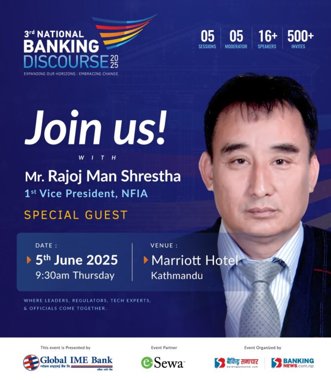 काठमाडौं – तेस्रो बैंकिङ्ग डिस्कोर्श २०२५ को उद्घाटन सत्रमा नेपाल वित्तीय संस्था संघका उपाध्यक्ष राजोज मान श्रेष्ठ सहभागी हुने भएका छन् । बैंकिङ्ग समाचार डटकमको आयोजनामा आगामी जेठ २२ गते हुने तेस्रो बैंकिङ्ग डिस्कोर्शको उद्घाटन सत्रमा श्रेष्ठ सहभागी हुने भएका हुन् ।