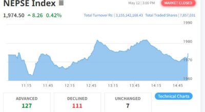 काठमाडौं– आज शेयर बजार बढेर बन्द भएको छ । आज शेयर बजार नेप्से परिसूचक ८