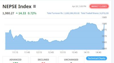 काठमाडौं – आज साताको पहिलो दिन शेयर बजार बढेर बन्द भएको छ । आज शेयर