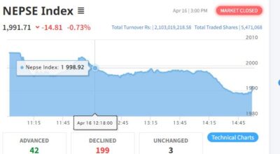 काठमाडौं – मंगलबार शेयर बजार दोहोरो अंकले घटेर बन्द भएको छ। आज शेयर बजार नेप्से