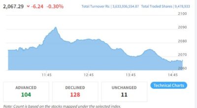 काठमाडौं– कारोबारको तेस्रो दिन शेयर बजारमा गिरावट देखिएको छ । नेपाल स्टक एक्सचेञ्ज (नेप्से) ६.२४
