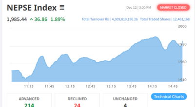 बैंकिङ्ग समाचार, काठमाडौं ।शेयरबजार नेप्सेमा आज मंगलबार ३६.८६ अंकले बढेर बन्द भएको छ । आज