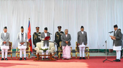 काठमाडौं – नवनियुक्त परराष्ट्रमन्त्री बालानन्द शर्माले राष्ट्रपति रामचन्द्र पौडेलसमक्ष पद तथा गोपनीयताको शपथ लिएका छन्