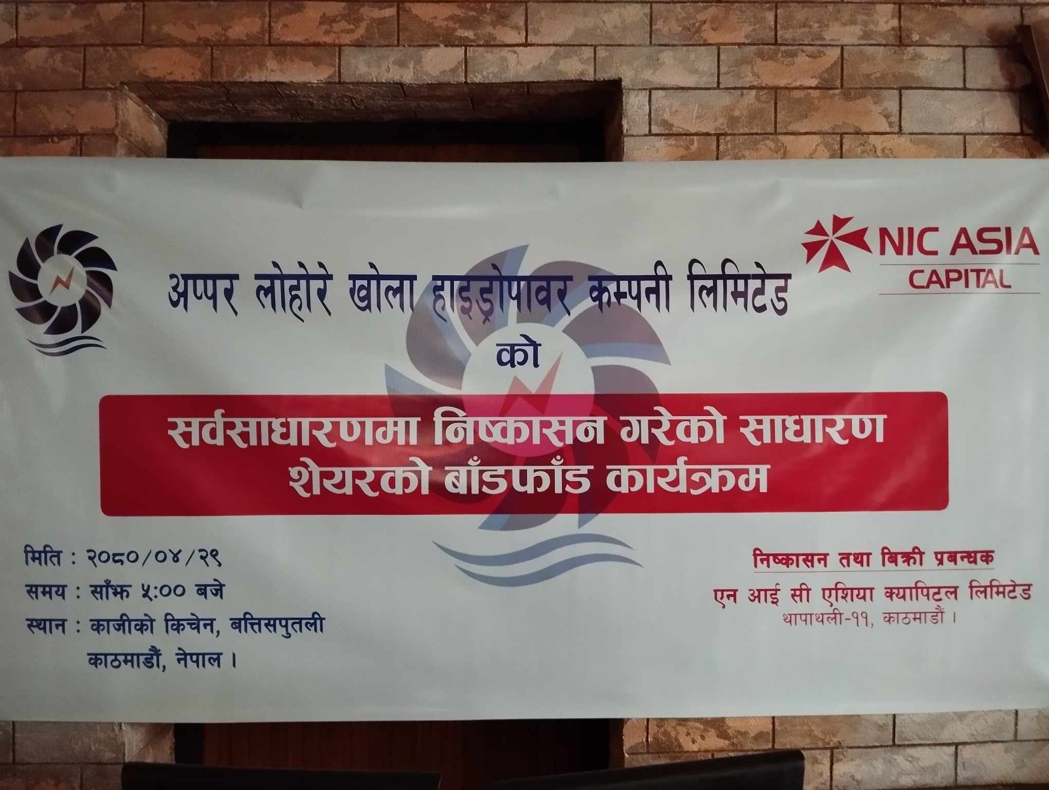बैंकिङ्ग समाचार, काठमाडौं । अप्पर लोहोरे खोला हाइड्रोपावर कम्पनी लिमिटेडले साउन १८ गतेदेखि २२ गतेसम्म
