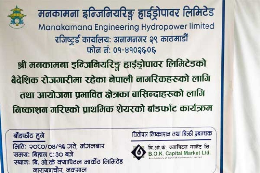 बैंकिङ्ग समाचार, काठमाडौं । मनकामना इन्जिनियरिङ्ग हाइड्रोपावर लिमिटेडको पहिलो चरणमा निष्काशित आईपीओ आज साउन १६