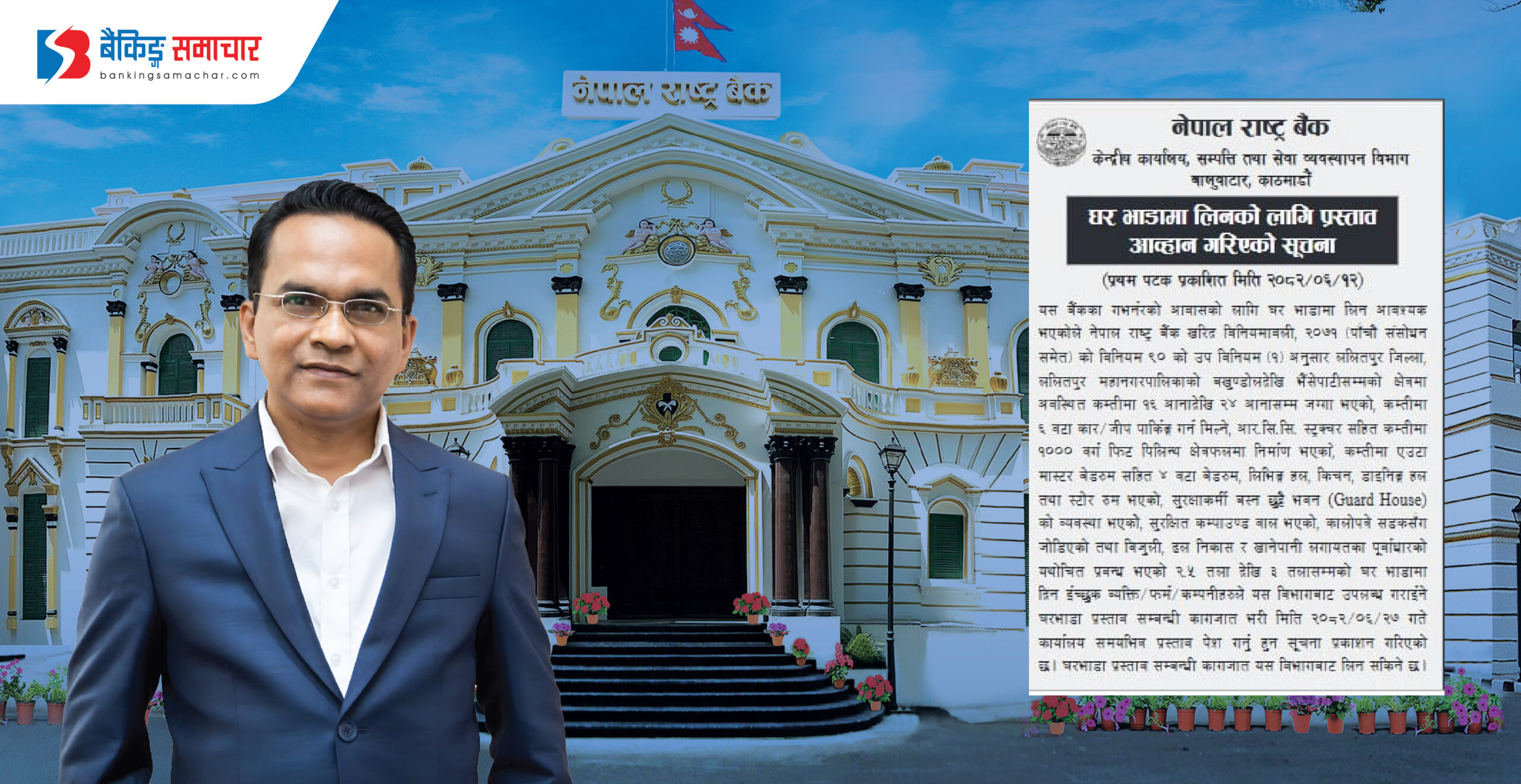 काठमाडौं – नेपाल राष्ट्र बैंकले गभर्नर डा. विश्वनाथ पौडेलका लागि घर भाडामा लिने भएको छ। केन्द्रीय बैंकले सूचना प्रकाशित गरी गभर्नर पाैडेलका लागि ललितपुरको बखुण्डोलदेखि भैंसेपाटी क्षेत्रसम्मको लागि घरभाडामा लिन प्रस्ताव आह्वान गरेकाे हाे । केन्द्रीय बैंककाे सम्पत्ति तथा सेवा व्यवस्थापन विभागद्वारा जारी सूचनामा ललितपुरको बखुण्डोलदेखि भैंसेपाटीसम्मको क्षेत्रमा कम्तीमा १६ आनादेखि २४ आनासम्म क्षेत्रफलमा निर्माण…