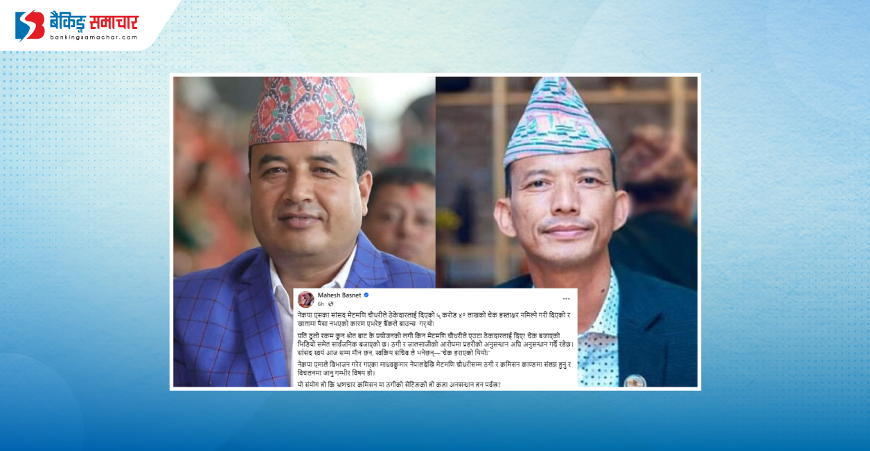 काठमाडौं – नेकपा एकीकृत समाजवादी पार्टी (एसका) सांसद तथा प्रमुख सचेतक मेटमणि चौधरीविरुद्ध हुलाकमार्फत बैंकिङ्ग कसुरको उजुरी परेको घटना बाहिरिएसँगै नेकपा एमालेका नेता महेश बस्नेतले कडा अनुसन्धान गर्न माग गरेका छन् । नेता बस्नेतले सामाजिक सञ्जाल फेसबुकमा स्ट्याटस लेख्दै यस विषयमा कडा अनुसन्धान गर्न माग गरेका हुन् । बस्नेतले सामाजिक सञ्जालमा लेखेका छन्,'नेकपा एसका सांसद मेटमणि चौधरीले ठेकेदारलाई दिएको…
