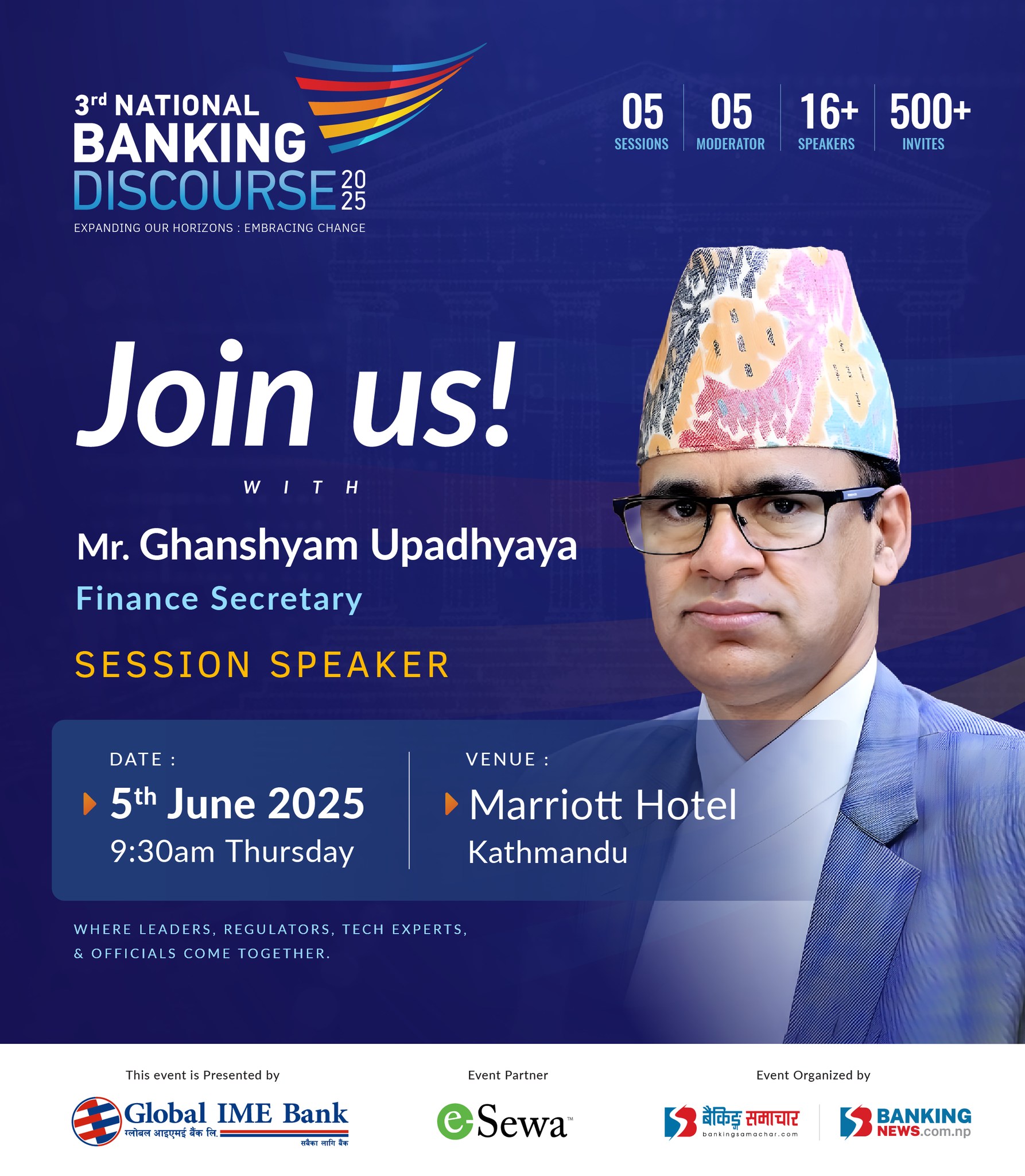 काठमाडौं – तेस्रो बैंकिङ्ग डिस्कोर्श २०२५ को चौथो सत्रको वक्ताका रूपमा अर्थ सचिव घनश्याम उपाध्याय सहभागी हुने भएका छन् । बैंकिङ्ग समाचार डटकमको आयोजनामा आगामी जेठ २२ गते हुने तेस्रो बैंकिङ्ग डिस्कोर्शको चौथो सत्र ‘मौद्रिक नीति: आर्थिक शिथिलताको चक्र तोड्न वित्त नीति र मौद्रिक नीतिको रणनीतिक साझेदारी’ मा वक्ताका रूपमा सहभागी हुने भएका हुन् ।…