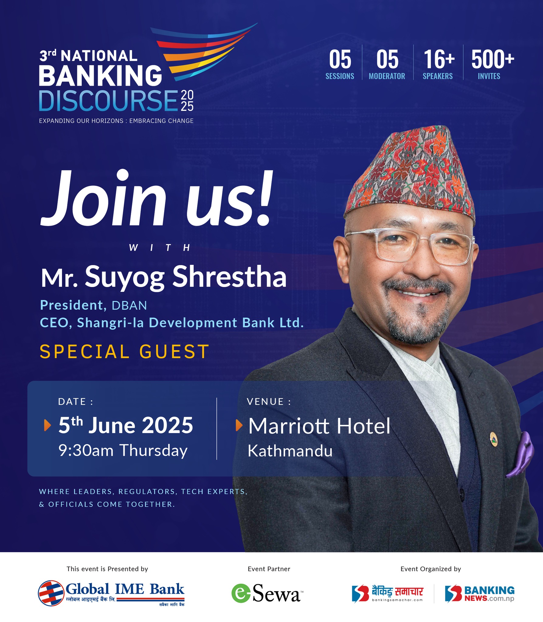 काठमाडौं – तेस्रो बैंकिङ्ग डिस्कोर्श २०२५ को उद्घाटन सत्रमा डेभलपमेन्ट बैंकर्स एशाेसिएसन (डिबान) का अध्यक्ष सुयोग श्रेष्ठ सहभागी हुने भएका छन् । बैंकिङ्ग समाचार डटकमको आयोजनामा आगामी जेठ २२ गते हुने तेस्रो बैंकिङ्ग डिस्कोर्शको विशेष सत्रमा श्रेष्ठ सहभागी हुने भएका हुन् । चार्टर्ड एकाउन्टेन्ट समेत रहेका श्रेष्ठ दुई दशकदेखि बैंकिङ्ग क्षेत्रमा आवद्ध रहेका छन् ।…