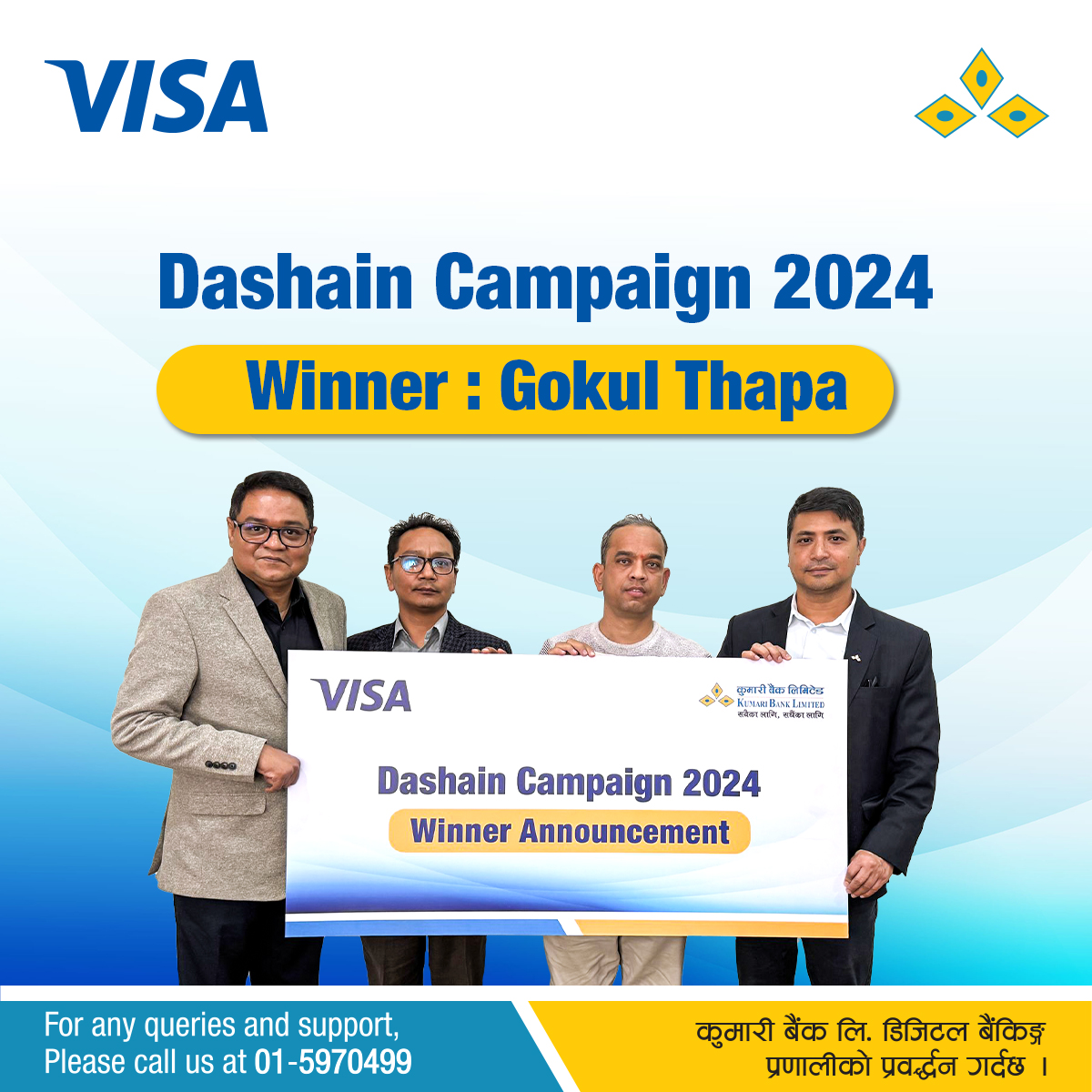 काठमाडौं - भिसाले सञ्चालन गरेको दशैं क्याम्पियन २०२४ अन्तर्गत कुमारी बैंकका ग्राहकहरु मध्य गोकुल थापाले पहिलो स्थान हासिल गरि विजेता बन्न सफल भएका छन् । त्यसैगरि कुमारी बैंककै कार्ड प्रयोगकर्ता क्षितिज भट्टराई पनि बिजेता भएका छन्। भिसा कार्डमार्फत डिजिटल भुक्तानीलाई प्रवद्र्धन गर्ने उद्देश्यका साथ सञ्चालन गरिएको यस अभियानमा नेपालमा अवस्थित भिसा मेम्बर बैंकहरुबाट टप २५…