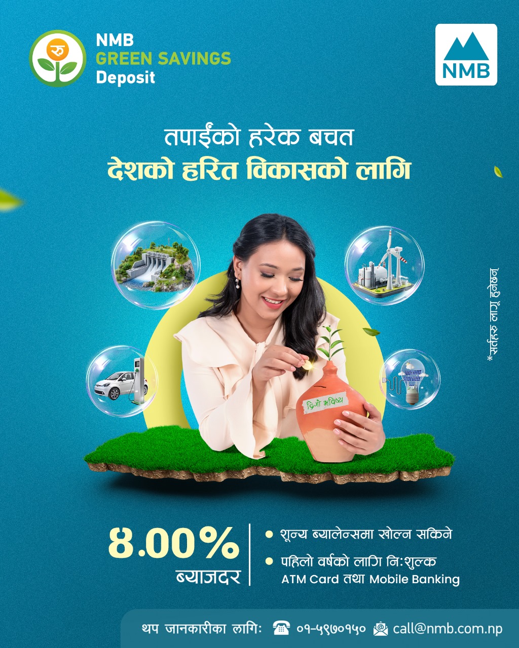 काठमाडौं - एनएमबि बैंकले ग्रीन सेभिङ्स डिपोजिट (हरित बचत खाता) नामक अत्यन्तै नौलो बचत खाता योजना सुरु गरेको छ । सो खाताले वातावरण संरक्षणमा व्यक्ति र संस्थाहरूलाई महत्वपूर्ण भूमिका खेल्न मद्दत गर्ने बैकले जनाएको छ । यस खातामा जम्मा भएको रकम सौर्य ऊर्जा, ऊर्जा बचत, र प्रकृतिलाई जगेर्ना गर्ने हरित परियोजनाहरूमा मात्र प्रयोग गरिनेछ ।…