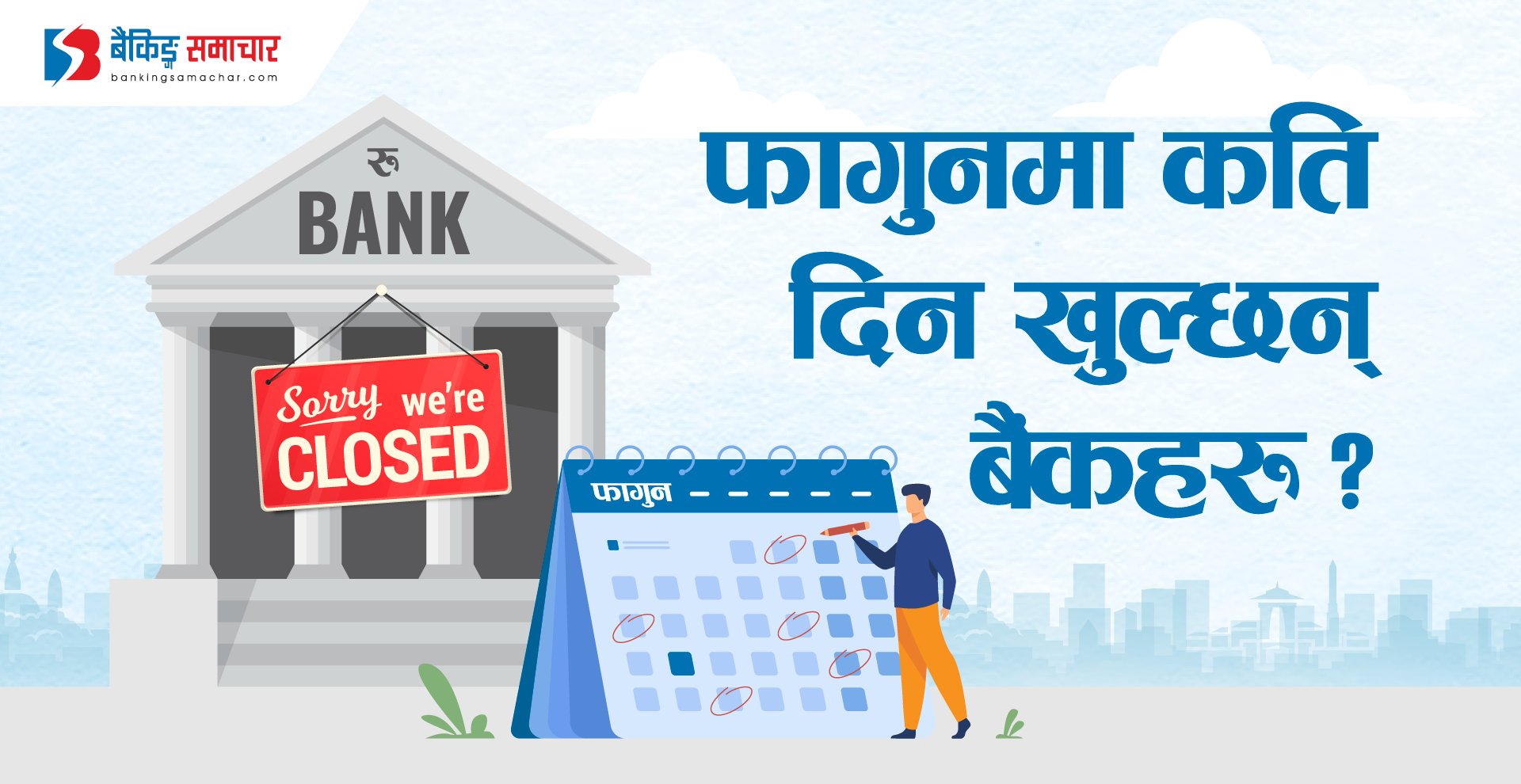 काठमाडौं - फागुन महिनामा ८ दिन बैंक तथा वित्तीय संस्थाहरू बन्द रहने भएका छन् । अन्य सार्वजनिक बिदा र शनिबारसहित आजबाट सुरु भएको फागुनमा बैंकहरुले २१ दिन सेवा दिने भएका हुन् । २९ काे महिना फागुनमा सार्वजनिक बिदा ४ दिन परेको छ भने शनिबार पनि ४ दिन नै रहेको छ । यस्तै, २४ गते भने…