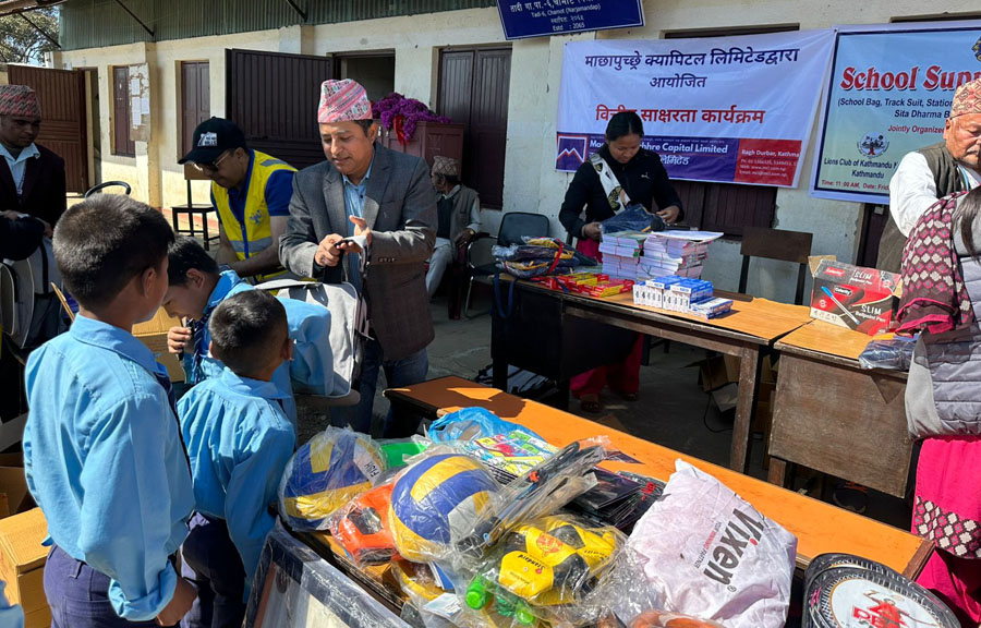 काठमाडौं - माछापुच्छ्रे क्यापिटल लिमिटेड, लायन्स क्लब्स अफ काठमाडौं नमस्ते र राष्ट्रिय बीमा संस्थानको संयुक्त आयोजनामा नुवाकोट जिल्लाको तादी गा.पा. वडा नं. ६ चामोटस्थित श्री सीता धर्म आधारभूत विद्यालयका १०४ बालबालिकालाई शैक्षिक सामाग्री, स्कुल व्याग, ट्राक सुट, खेलकुद सामाग्री लगायतका आवश्यक सामाग्री वितरण गरिएकाे छ । कार्यक्रममा माछापुच्छ्रे क्यापिटल लिमिटेडका अध्यक्ष विश्वम्भर न्यौपाने र प्रमुख…