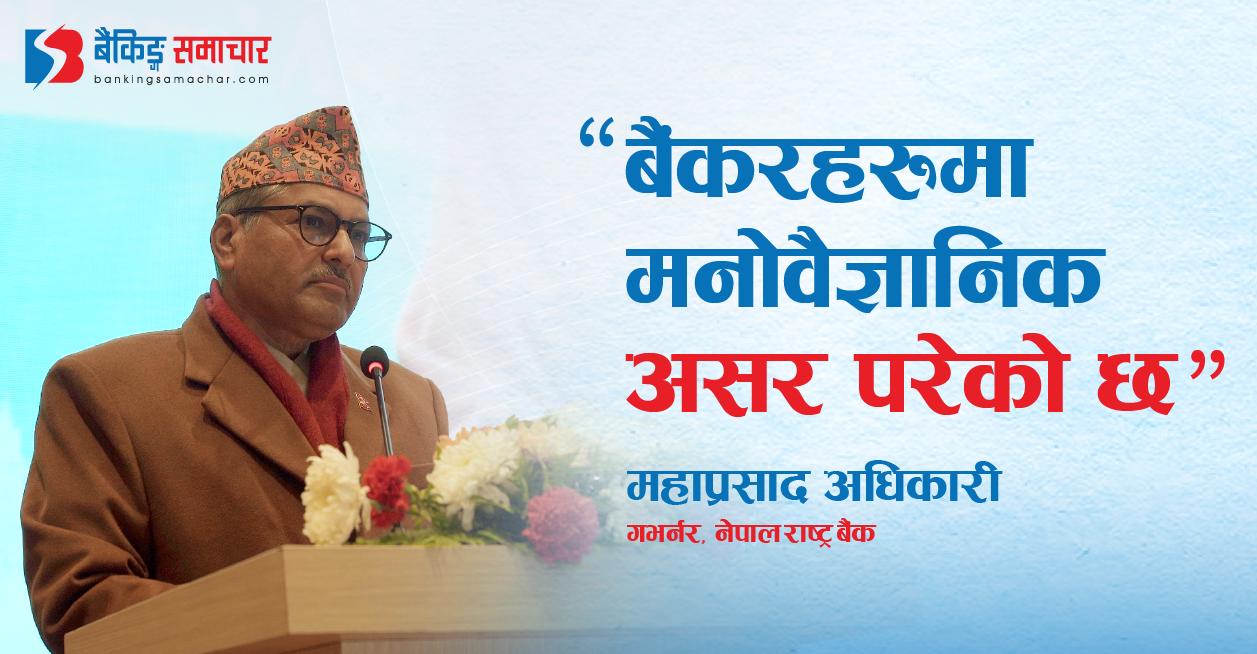 काठमाडौं – नेपाल राष्ट्र बैंकका गभर्नर महाप्रसाद अधिकारीले बैंकहरुले गरेको लगानी उठाउन नसक्दा तनावपूर्ण अवस्थामा रहेको बताएका छन् । काठमाडौंमा आयोजित नेपाल बैंकर्स संघको वार्षिक साधारण सभालाई सम्बोधन गर्दै बैंकिङ्ग प्रणालीलाई सुरक्षित राख्न सकिरहेको बताएका हुन् । https://youtu.be/F20AQiwRKJY अधिकारीले कोरोनालगायत विश्वव्यापी समस्यामा पनि नेपाली बैंकिङ्ग क्षेत्र खरो बनेर उभिएको भन्दै विश्वव्यापीकरणको लाभ लिइरहँदा विश्वव्यापी रूपमा…