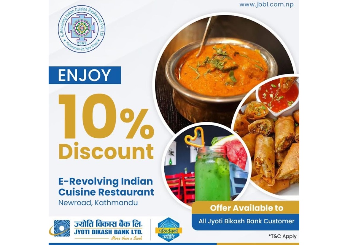 काठमाडौं – ज्योति विकास बैंकले काठमाडौंस्थित इ – रिभल्भिङ इन्डियन कुजिन रेस्टुरेन्टमा आफ्ना ग्राहकहरूलाई १० प्रतिशतसम्मको विशेष छुट प्रदान गर्ने सम्बन्धी सम्झौता गरेको छ। यस सम्झौतापछि ज्योति विकास बैंकका ग्राहकहरूले उक्त रेस्टुरेन्टमा १० प्रतिशतसम्म छुट प्राप्त गर्न सक्ने छन् । स्वादिष्ट परिकार, आकर्षक वातावरण, उत्कृष्ट आतिथ्य सेवा र हरेक ४६ मिनेटमा एक सुस्त घुमाउरो घुम्ने…