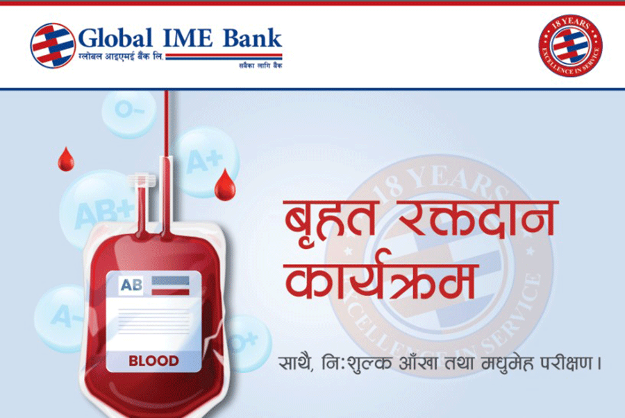 काठमाडौं – ग्लोबल आईएमई बैंक लिमिटेडको १८औं वार्षिकोत्सवको अवसरमा आयोजित बृहत रक्तदान कार्यक्रममा ७५७ जनाले रक्तदान गरेका छन् । ग्लोबल आईएमई बैंक १८ पुसदेखि १८ वर्ष पूरा गरी १९औं वर्षमा प्रवेश गरेको छ । यही अवसरमा बैंकले सातै प्रदेशमा एकैसाथ रक्तदान कार्यक्रमका साथै निःशुल्क आँखा जाँच, रक्तचाप तथा मधुमेह परीक्षण कार्यक्रम सञ्चालन गरेको थियो ।…