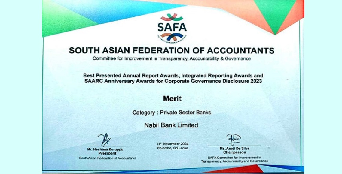 काठमाडौं – नबिल बैंक लिमिटेडलाई दक्षिण एसियाकै (निजी बैंक तर्फ) उत्कृष्ट वित्तीय प्रतिवेदन अवार्डस्मा मेरिट अवार्ड प्रदान गरिएको छ । साउथ एसियन फेडरेसन अफ एकाउन्टेन्स् (साफा) ले सोमबार श्रीलंकामा आयोजित विशेष सभामा नबिललाई मेरिट अवार्डबाट पुरस्कृत गरेको हो। दक्षिण एसियाका निजी क्षेत्र बैंकिङतर्फ आर्थिक वर्ष सन् २०२२/२३ को वित्तीय प्रतिवेदनका आधारमा नबिल बैंकको वित्तीय पारदर्शिता,…