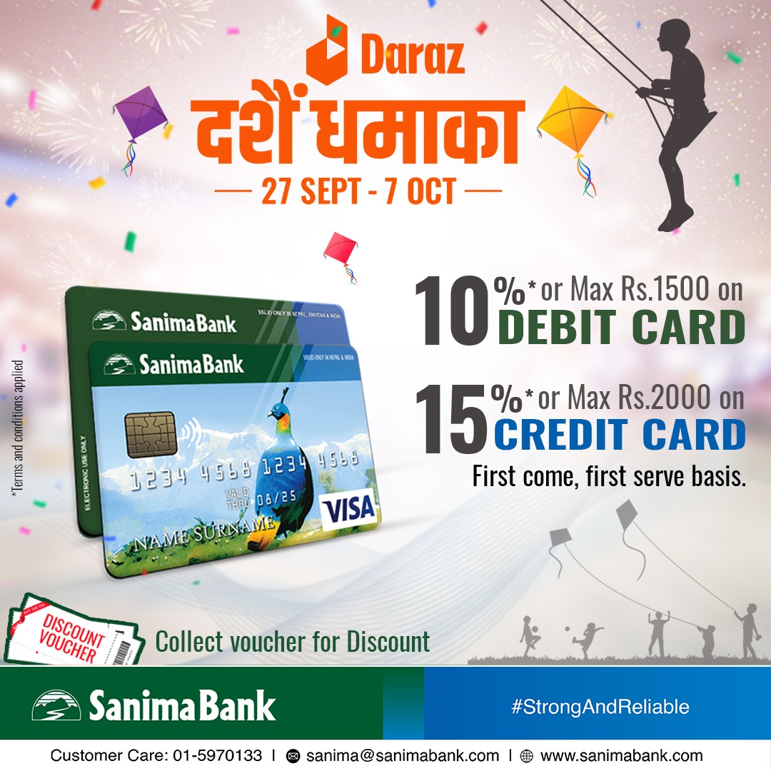 काठमाडौं – सानिमा बैंकले ग्राहकहरुका लागि बडा दशैंको अवसरमा दराजसंग दशैं धमाका योजनामा विशेष छुट दिने सहकार्य गरेको छ । योजना अवधिभर दराजबाट सामान खरिद गरी ग्राहकहरुले सानिमा बैंकको डेबिट तथा क्रेडिट कार्डबाट अग्रीम भुक्तानी गर्दा विशेष छुट प्राप्त गर्न सक्नेछन् । ग्राहकहरुले डेबिट कार्डबाट भुक्तानी गर्दा १० प्रतिशत वा अधिकतम् एक हजार ५०० रुपैयाँसम्मको…